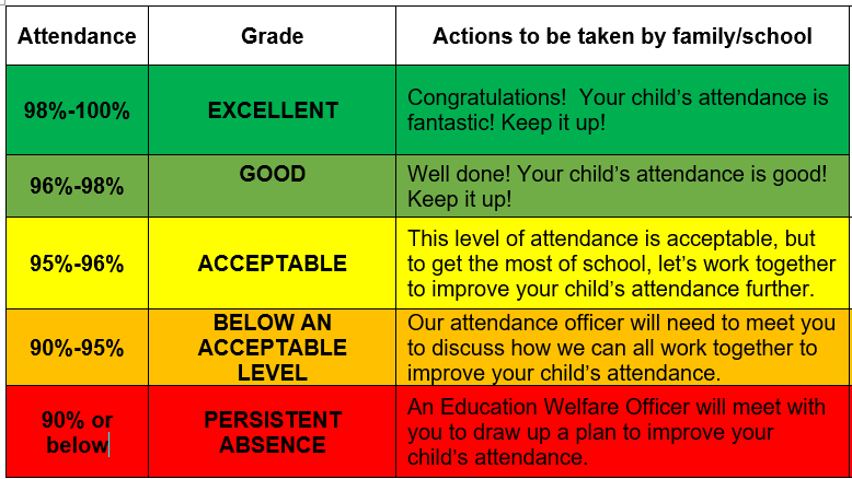 Every opportunity is taken by the school to encourage all pupils to come to school regularly. We have a designated pastoral team who work closely with our families and support them with attendance concerns.